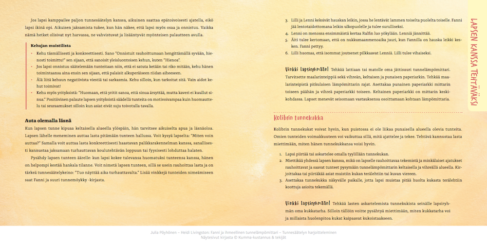Kaikissa sarjan kirjoissa on lämminhenkinen tarina lapsen kanssa luettavaksi, tunnetaidoista kertova osuus kasvattajalle ja vanhemmalle sekä harjoituksia lapsen kanssa tehtäväksi kodin arkeen ja päiväkotiin.